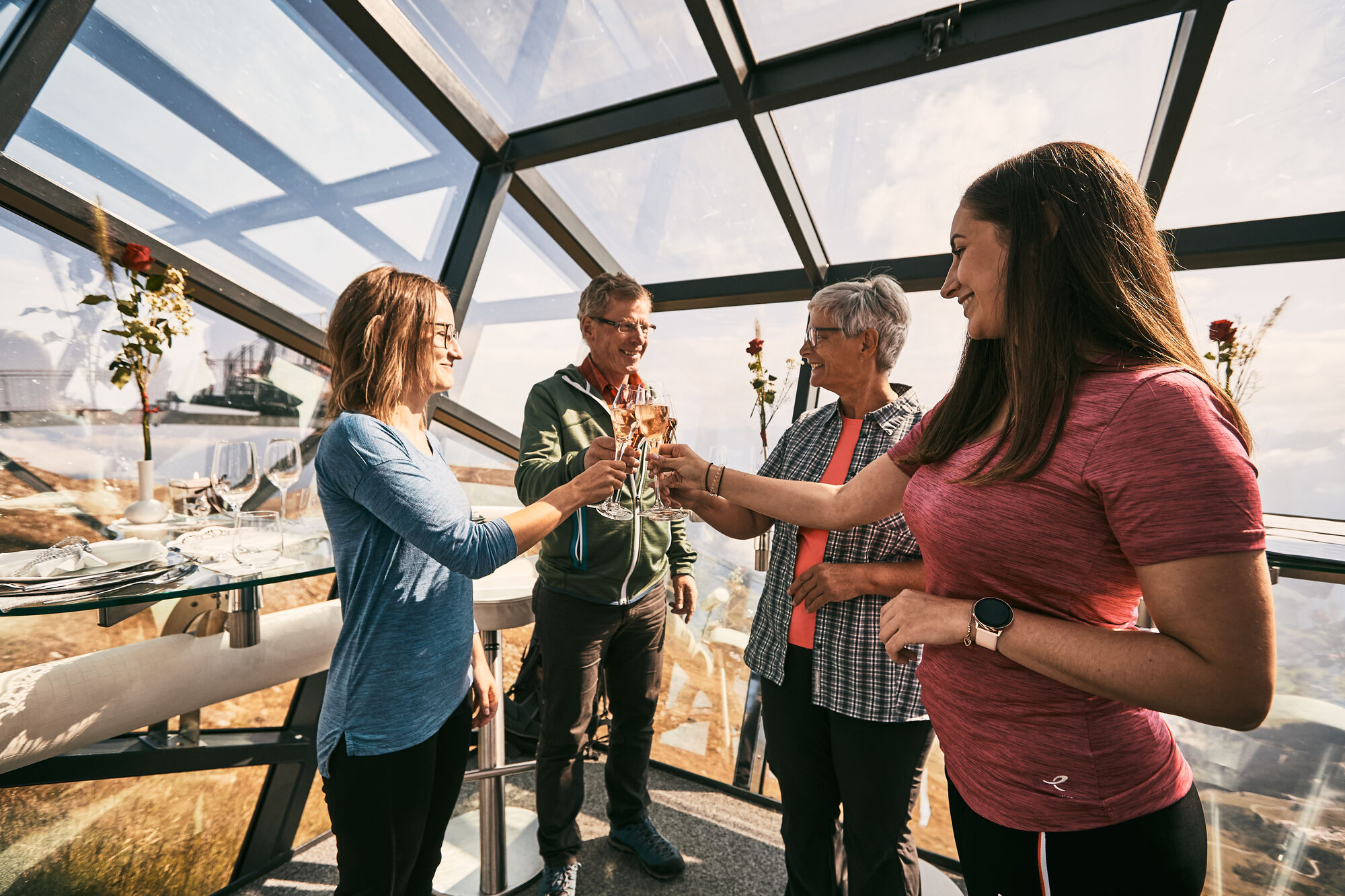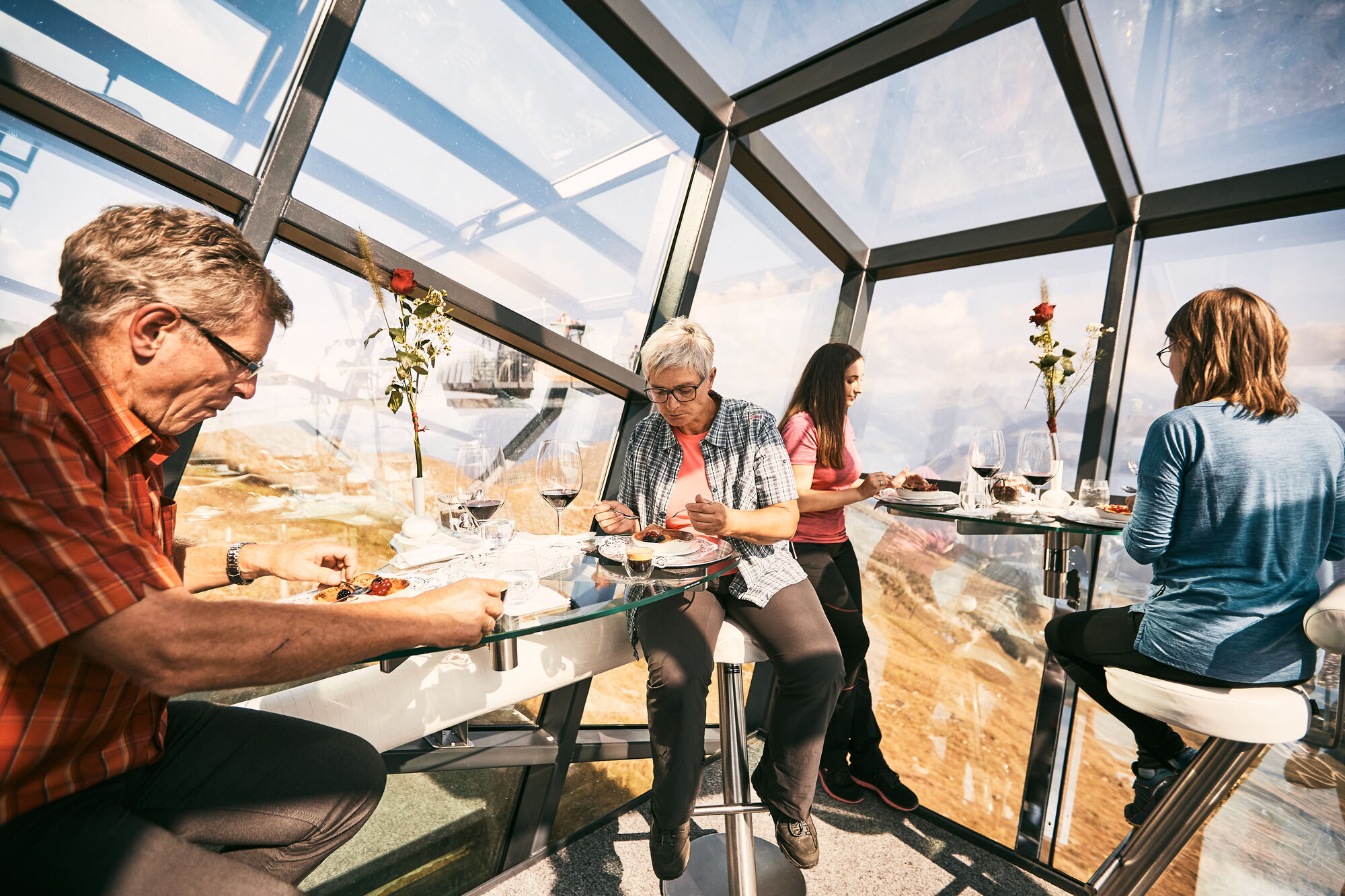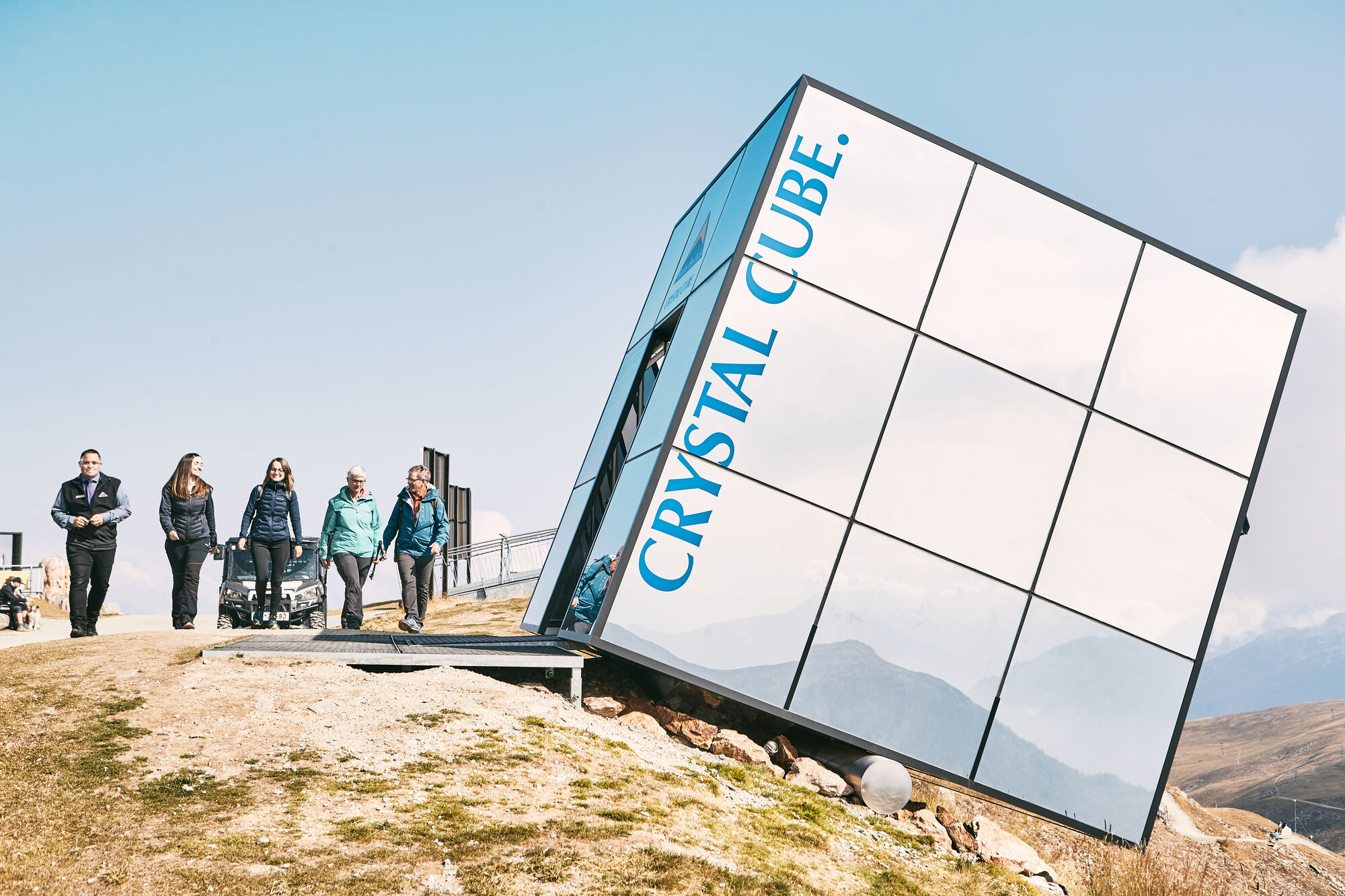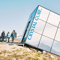 Für alle, die den noch nie da gewesenen Hoch-Genuss suchen, bietet die Tiroler Ferienregion Serfaus-Fiss-Ladis eine neue Gourmet-Adresse: The Crystal Cube. In der Nähe der Aussichtsplattform des Fisser Zwölferkopfs steht auf 2.600 Meter Höhe ein Riesen-Würfel schräg in der Landschaft. Er ist von außen komplett verspiegelt, erlaubt keine Blicke nach innen und mutet daher leicht extraterrestrisch an. Hat man den Würfel betreten, ändert sich das Bild gewaltig. Durch die komplette Verglasung hat man einen fantastischen 360 Grad Rundum-Blick auf das grandiose Bergpanorama. Dabei glaubt man, bedingt durch die Schrägstellung des Würfels, an der Bergschulter zu kleben.