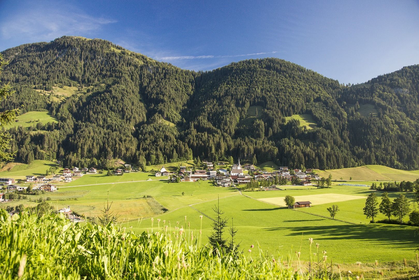 Vom Gästehaus Elisabeth aus Richtung Buchensteinwandrundweg. Über die Fieberbrunner Weiler Pertrach und Schönau gelangt man entlang der Bahnstrecken Richtung Vornbichl. Ein herrlicher Panoramablick Richtung...